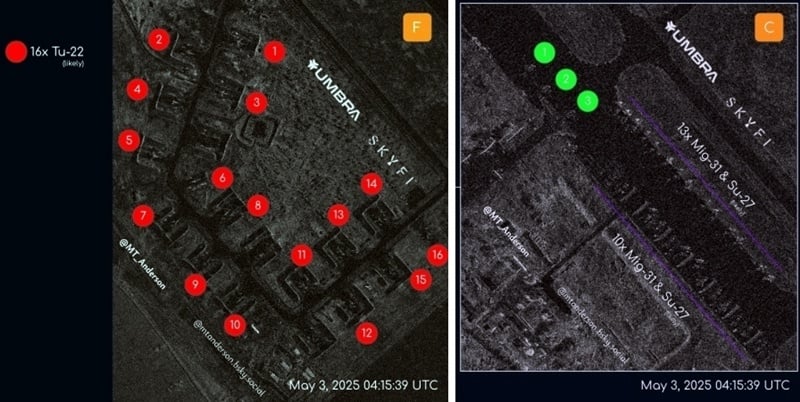 Na zdjęciach satelitarnych z 3 maja widać, że zgromadzono tam aż 10 Tu-95. Według analityków, jest tam również duża liczba – aż 16 bombowców Tu-22M3, a także myśliwce MiG-31 i Su-27, również co najmniej jeden, ale może nawet 4 bombowce Tu-160 i kilka transportowców An-26 – podaje RBK-Ukraina.