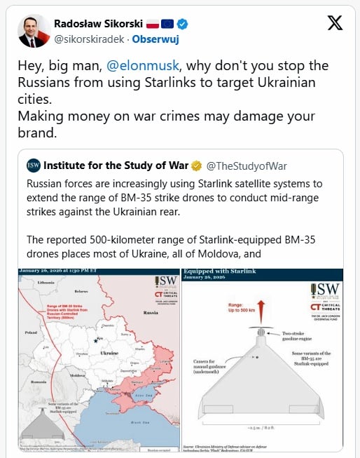 “Hej, wielki człowieku, czemu nie powstrzymasz Rosjan przed używaniem Starlinków do atakowania ukraińskich miast? Zarabianie pieniędzy na zbrodniach wojennych może zaszkodzić twojej marce” – napisał szef polskiej dyplomacji w mediach społecznościowych (X).
