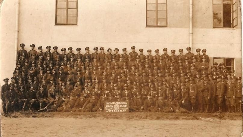 Kompania szkoleniowa batalionu Korpusu Ochrony Pogranicza „Wilejka” z koszarami w tle. Lata 30. XX wieku. Zdjęcie: Facebook