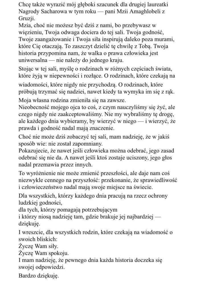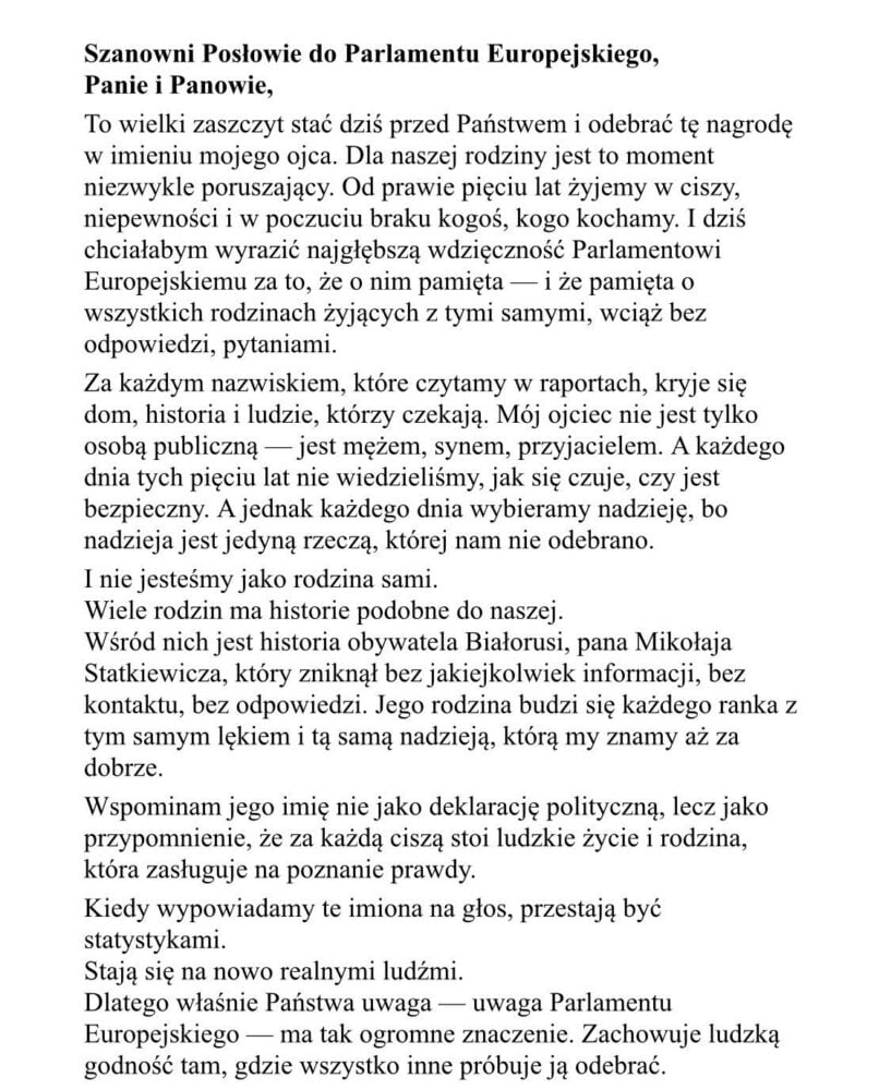 Przypomnijmy, nagrodę z rąk przewodniczącej Parlamentu Europejskiego Roberty Metsoli odebrała córka Andrzeja Poczobuta – Jana. W Strasburgu towarzyszyli jej Robert Tyszkiewicz, doradca marszałek Senatu Małgorzaty Kidawy-Błońskiej ds. Polonii, oraz Anna Kietlińska.